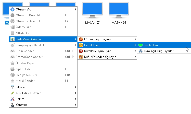 Seçim yaptığınız anda ilgili client bilgisayarlarda sesli bildirim çalınır ve mesaj kullanıcıya doğrudan iletilir.