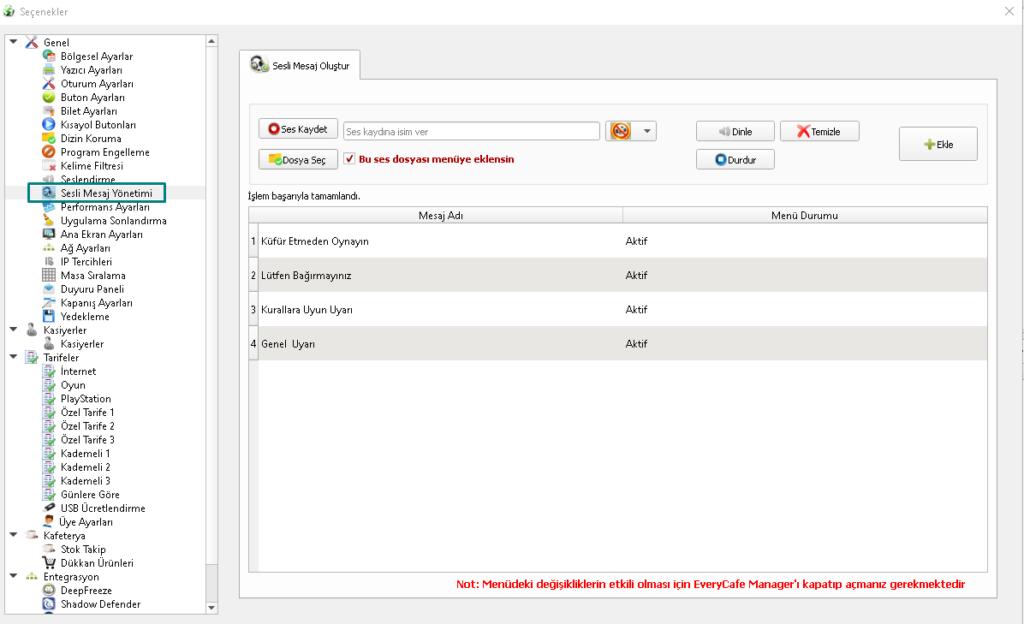 EveryCafe Manager’a eklenen yeni “Sesli Mesaj Oluştur” paneli ile artık kendi sesli anonslarınızı