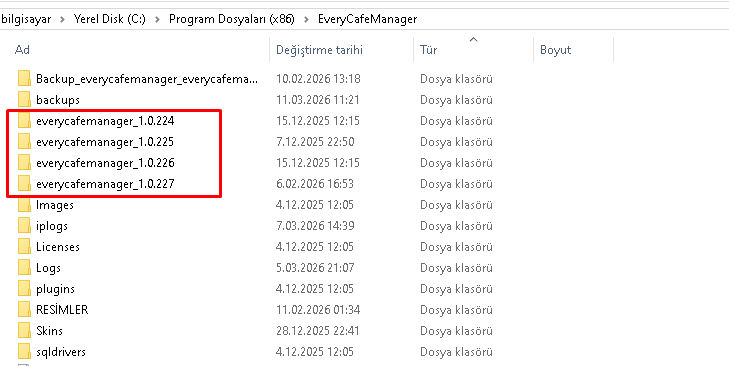 EveryCafe güncellendiğinde, kurulum klasörünün içinde eski sürümlere ait klasörler otomatik olarak oluşturulur.