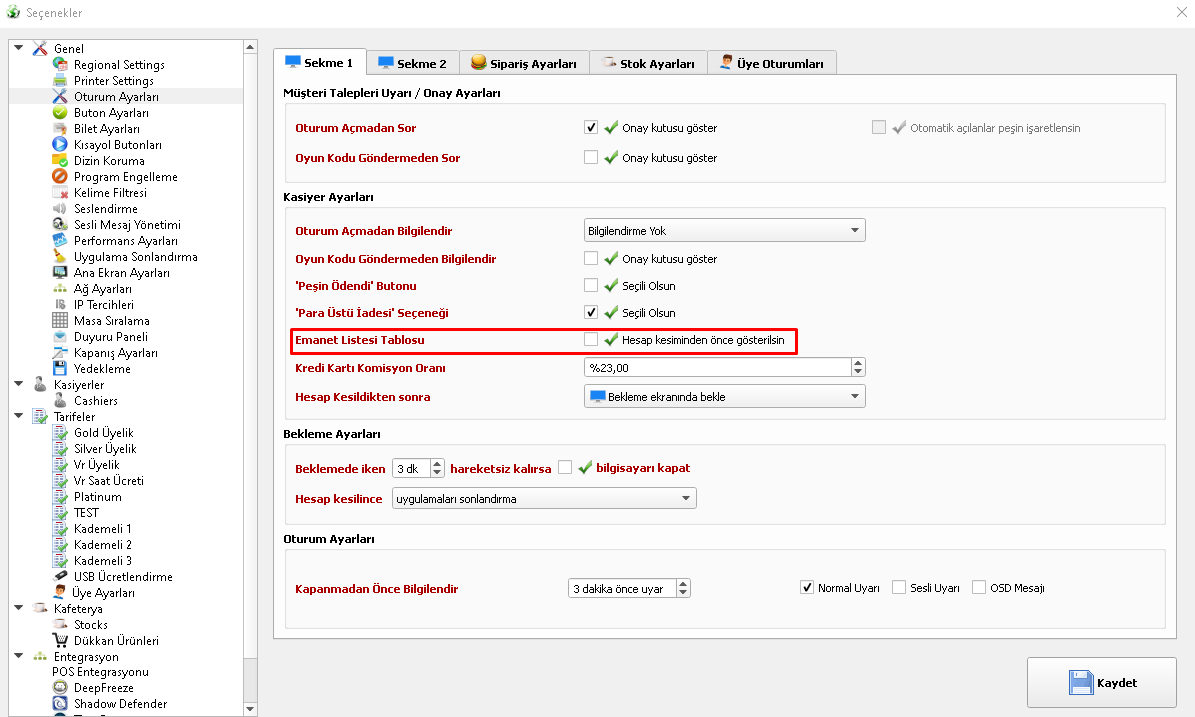 Emanet listesinin ne zaman karşınıza çıkacağının kontrolü artık sizde! Gelen talepler doğrultusunda, emanet listesinin hesap kesiminden önce mi yoksa sonra mı açılacağı ayarlanabilir hale getirildi. (Erişim: Araçlar → Seçenekler → Oturum Ayarları → Emanet Listesi). Aktif edildiğinde, emaneti olan masaya çift tıklandığında hesap kesilmeden önce emanet listesi otomatik açılır.